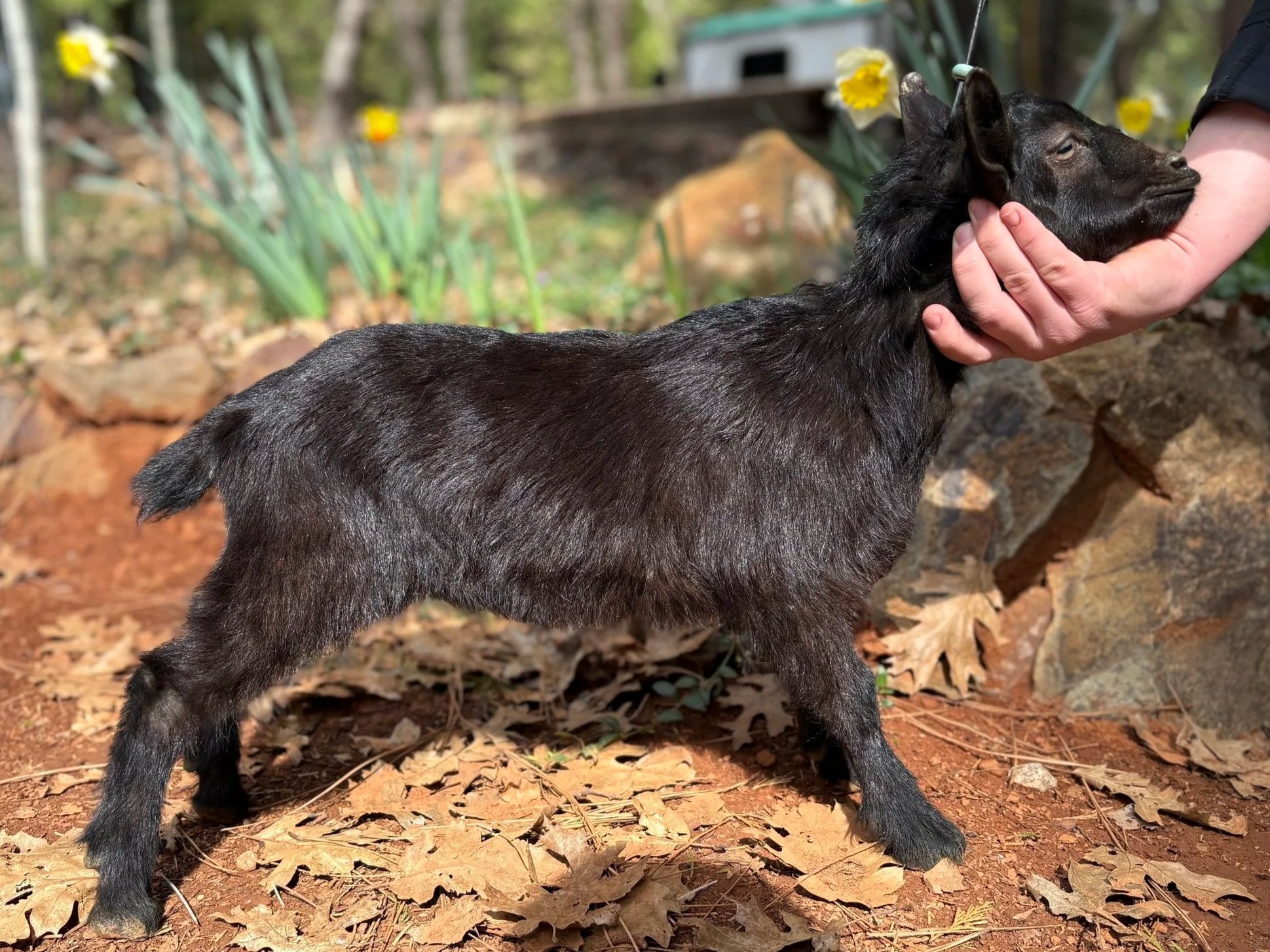 Crystal gave us two beautiful polled (naturally hornless) daughters from “Spock” last year. One is staying in the Ruby Volcano herd and the other one is available. This doe is incredibly friendly. She would make a perfect 4-H project and has a lot of potential in the ring.
