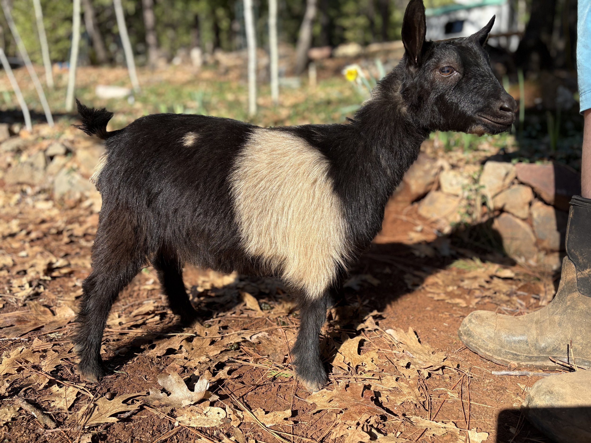 Tuxedo is a proven sire who throws gorgeous kids with moonspots. He is very friendly and very loved here. His dam is one of our favorites and we have kept a number of her daughters which means Tuxedo doesn’t have a lot of work to do here on our farm.